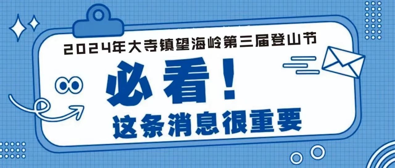 2024年大寺镇望海岭第三届登山节赛将于 10 月 19 日上午9:00(8:00开始签到)在大寺镇举行,目前赛事已进入最后的准备阶段。相信你们定是跃跃欲试,满心期待。为给跑友们提供更好的服务,小编精心整理了一些有关比赛的重要信息,大家务必仔细阅读哦!