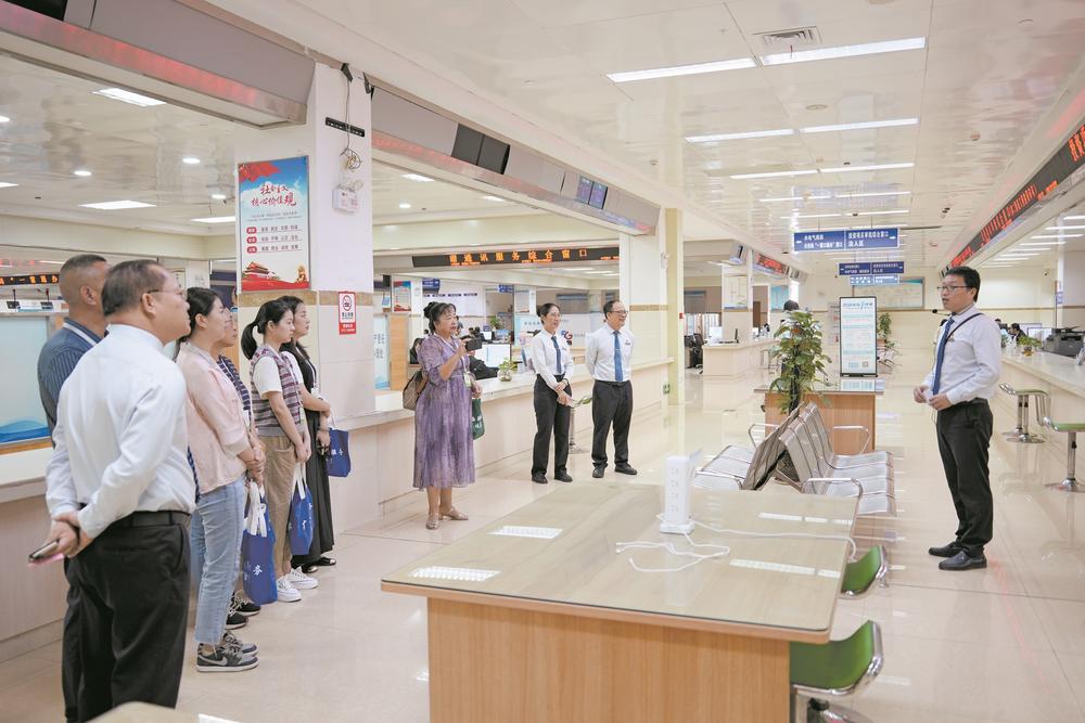 行政审批局工作人员在投资项目审批等综合窗口为政务服务体验官讲解政务服务“主动办”事项。