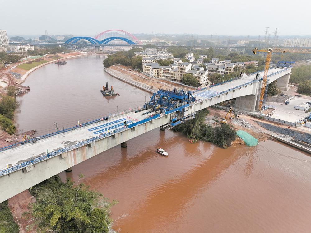 钦北铁路185米刚构连续梁拱桥顺利合龙。 记者 梁生 摄