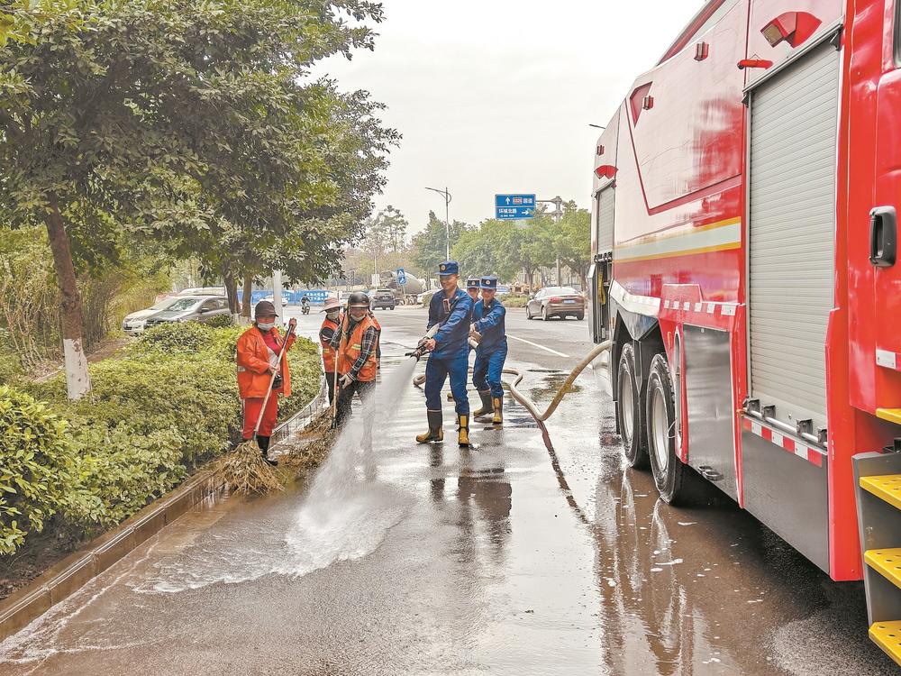 消防员抵达辖区各主次干道作业点后,立即与现场辛勤清扫的环卫工人热情沟通,相互配合、分工合作。针对周边现场环境和道路交通安全情况,精心制定规范合理的清洗作业流程,全力为过往群众营造清爽祥和、充满新年气息的出行环境,让市民能在整洁街道上满怀喜悦迎接新的一年。