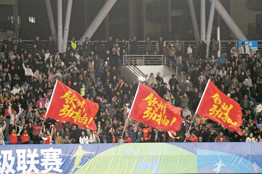 球迷自发组织加油队伍,三面“钦州劲抽”旗帜彰显主场热情。