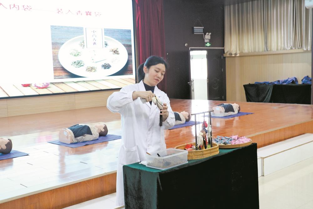 老师现场进行中药香囊的制作展示。
