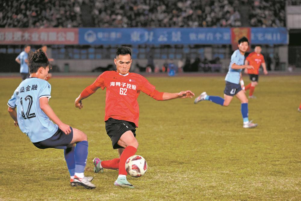 钦北队队员拔脚射门。 记者 赵冠雄 摄