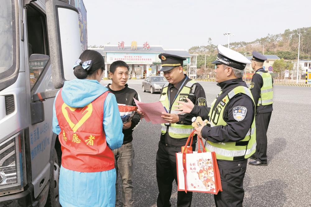 浦北交警联合相关部门开展春运交通安全宣传。 冯太宇 摄