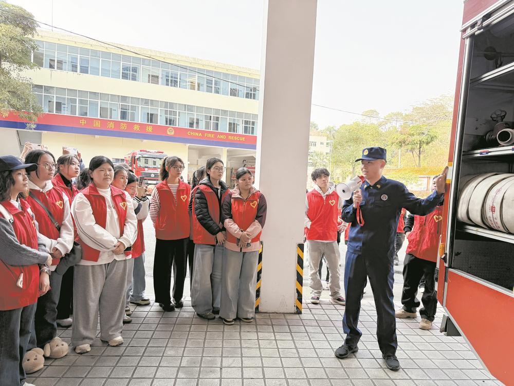 活动中,大学生志愿者走进消防站,在消防员的带领下,他们近距离接触各类消防车辆与救和装备。在消防安全培训中,消防宣传员聚焦家庭防火、冬春火灾防控、初期火灾处置及火场逃生等实用内容,详细讲解志愿者应如何向群众科普消防知识。