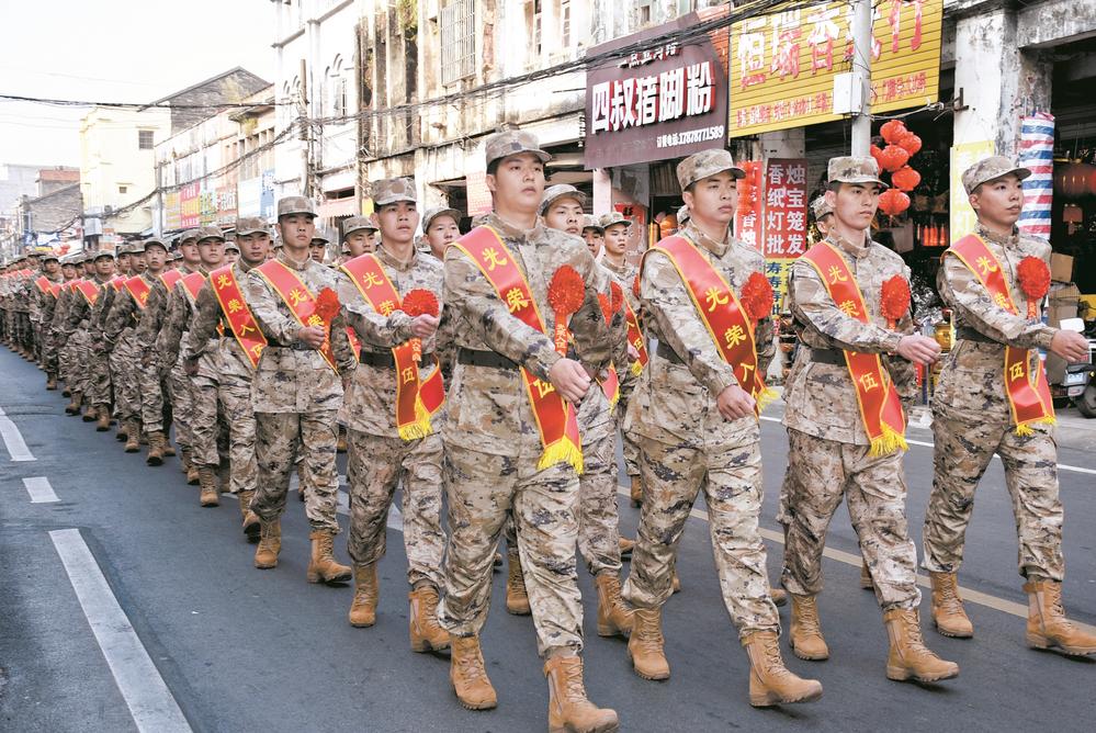 入伍新兵迈着整齐步伐巡游家乡。 郑邦钦 摄