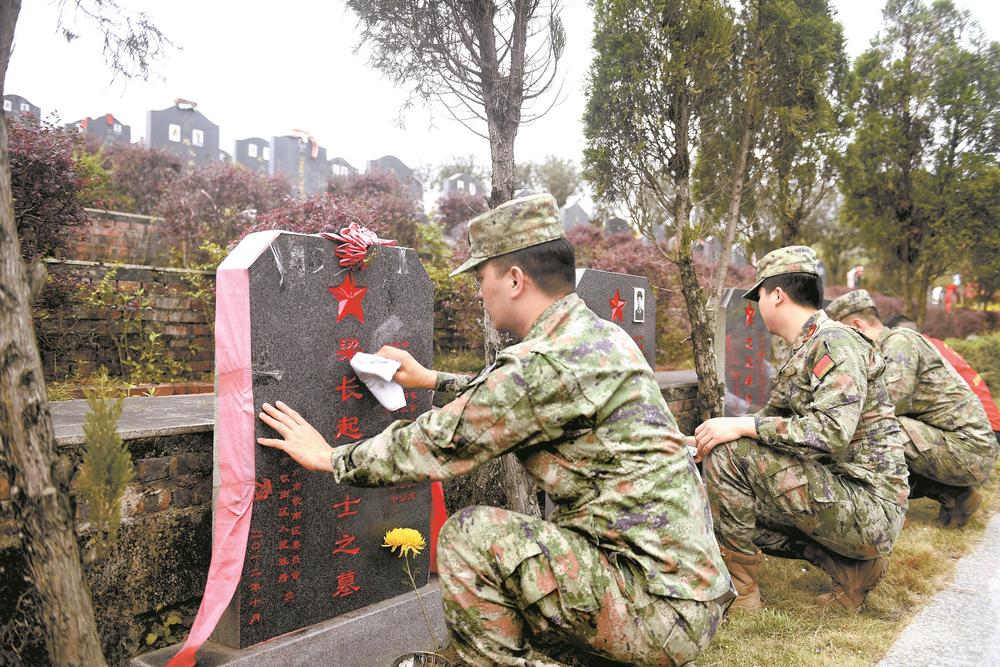 55年前,在这里长眠的方林成、叶炳明、林泉杰等10位烈士在革命斗争中,英勇顽强、不怕牺牲,为祖国和人民献出了宝贵的生命。祭扫现场,钦州军分区、钦州市退役军人事务局、钦南区退役军人事务局等单位党员干部代表和退役军人志愿者代表怀着无比崇敬的心情,共同缅怀革命先烈,表达无限敬仰和深切哀思。全体人员神情肃穆,手持菊花、默哀鞠躬,随后,大家认真擦拭墓碑、清理杂草、敬献鲜花,贴心为远方家属代祭寄思。在墓碑前,志愿者通过视频连线,向烈士家属郑重汇报了祭扫情况,当家属在屏幕中看到烈士的墓碑时,眼中饱含热泪。