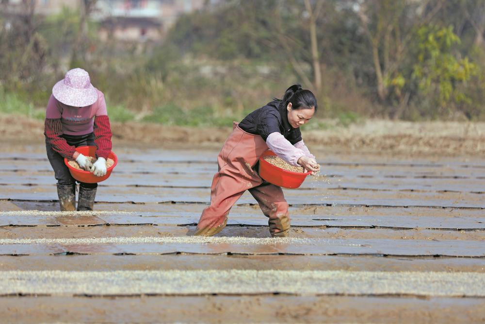 俯瞰稻田,育秧田地膜整齐铺开、田块线条分明,农户们的身影在田垄间穿梭忙碌,当地正以点带面推进春耕备耕,确保播种面积稳定、粮食产量提升。