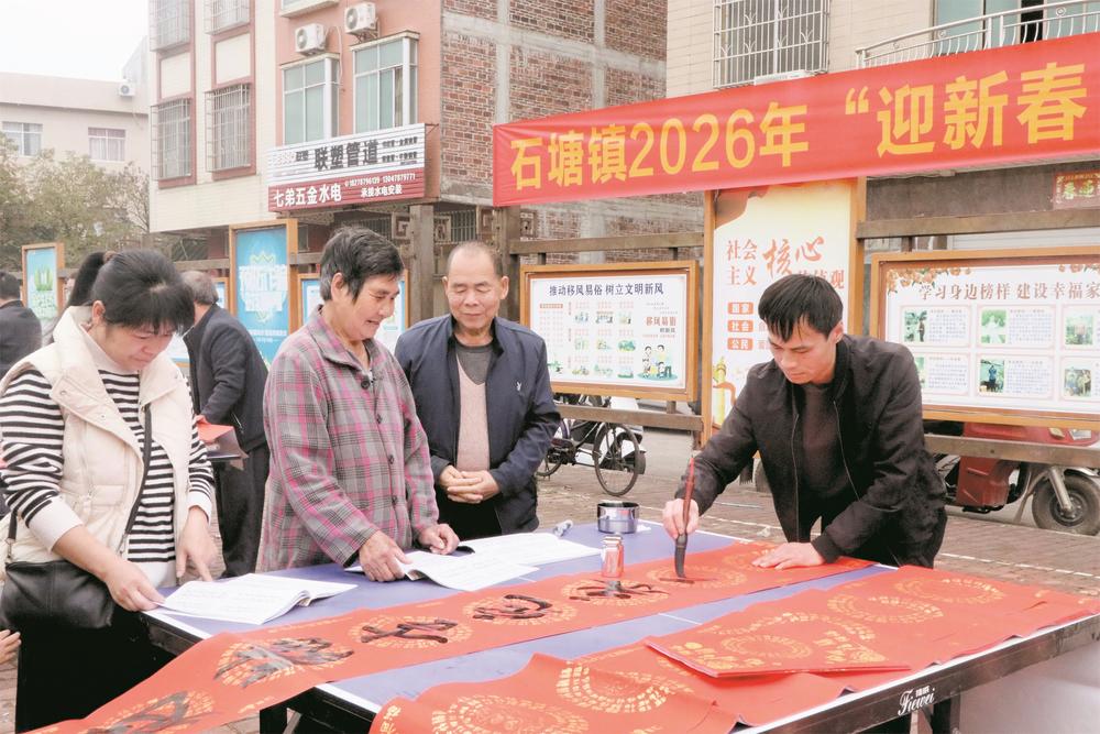 石塘镇已连续8年举办手写春联送祝福活动,此次活动持续七个多小时,现场书写并赠送春联、“福”字300多副。一副副红彤彤的春联,不仅传递了浓浓的年味,更承载着对广大群众的新春关怀与美好祝愿,是丰富群众精神文化生活、推进乡村文化振兴的生动实践。