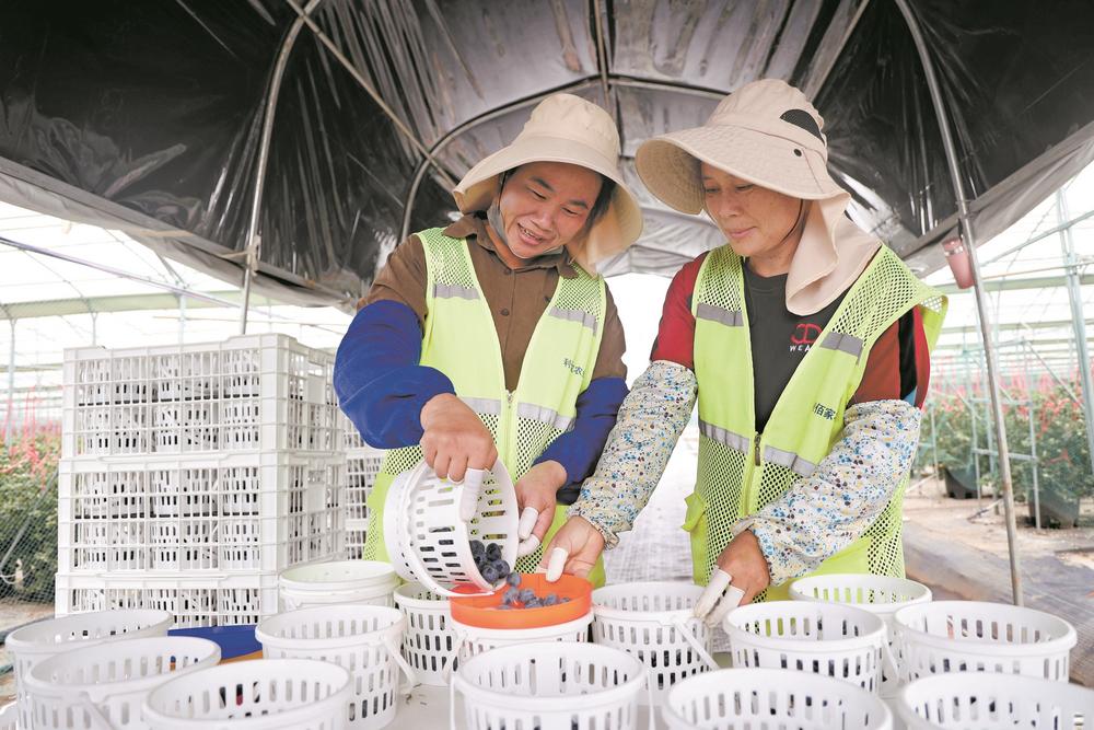 古隆村村民凌大龙(左)忙着分筛蓝莓。