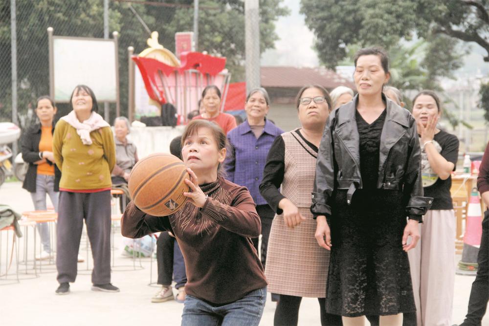 妇女参加立定投篮趣味互动项目。