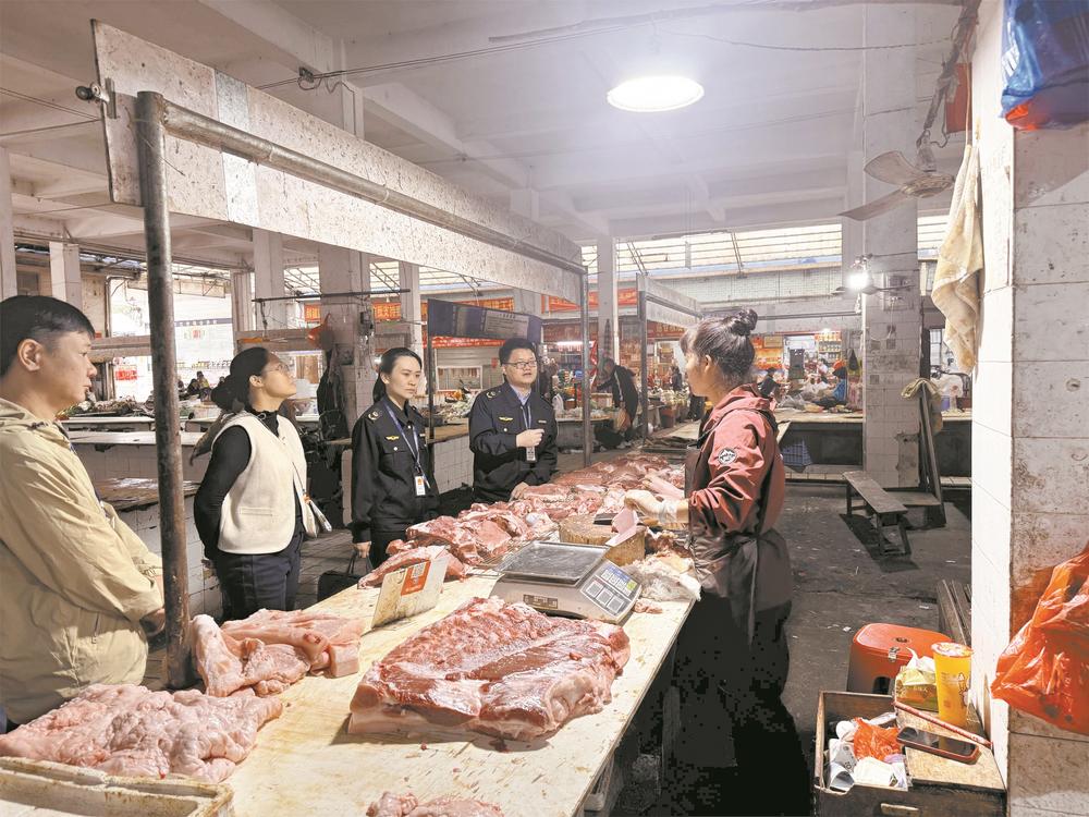 执法人员对鲜肉经营户进行“生鲜灯”使用情况检查。