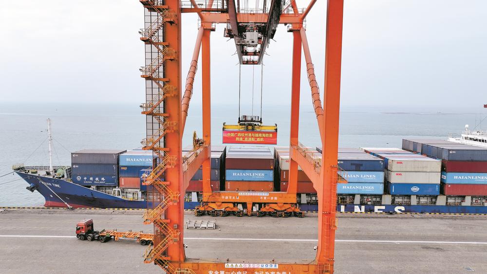 12月25日上午,满载着玻璃、钢铁制品、汽车配件等货物的“海安时光”号集装箱船从钦州港大榄坪作业区1号泊位缓缓起航,标志着钦州港与越南海防港跨境“直通船”成功首航,两港之间“两点往返、定时定班、安全便利”的跨境海上穿梭班轮实现常态化运行,将有力提升中越两国的贸易便利化水平。