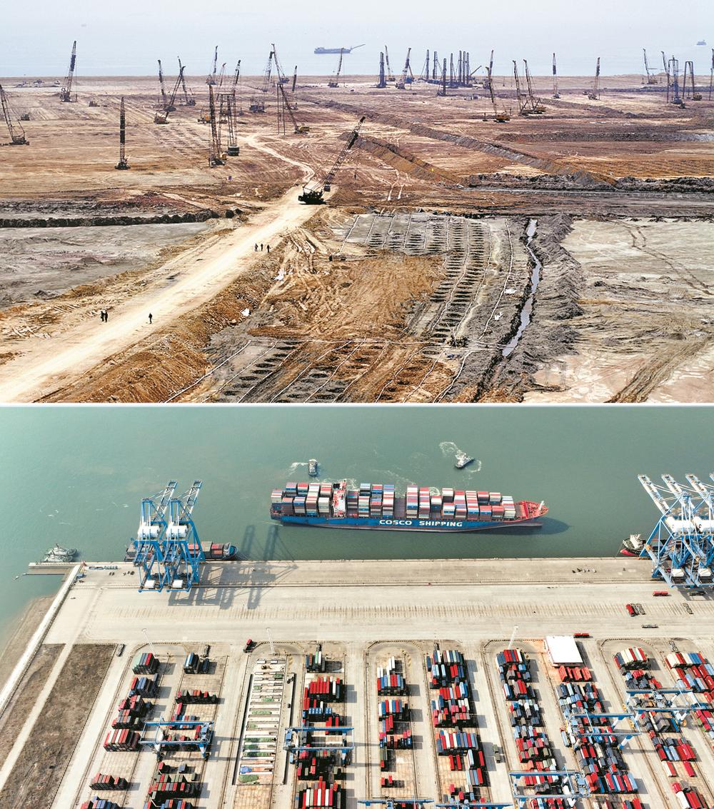 拼版照片:上图为2009年5月5日拍摄的钦州港集装箱码头开工建设场景(新华社记者张爱林 摄);下图为2024年12月31日,一艘海轮在钦州港集装箱自动化码头泊岸(无人机照片)。(新华社记者 吕 帅 摄)