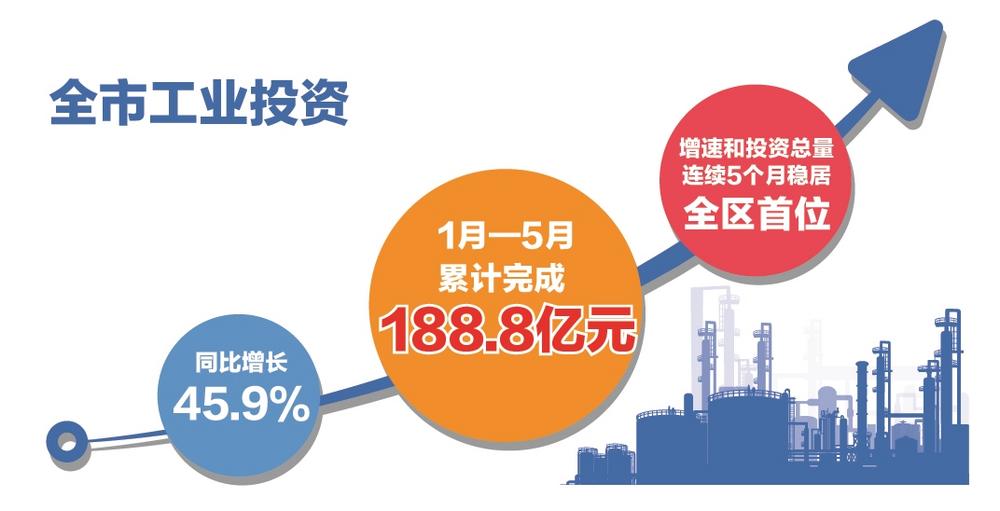 工业投资,强劲增长。今年5月全市工业投资单月完成28.4亿元,1月—5月累计完成188.8亿元,同比增长45.9%,增速和投资总量连续五个月稳居全区首位,工业展现出强劲的发展动能。