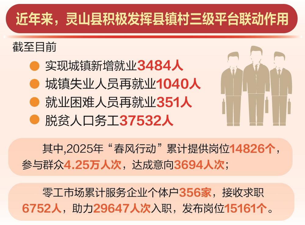 近年来,灵山县打造规范化零工市场,通过广西嘉诚人力资源公司,建成“智能化+规范化”零工市场、开发“灵工直聘”平台,运用大数据实现“24小时不打烊”匹配,累计服务企业个体户356家,接收求职6752人,助力29647人次入职,发布岗位15161个。
