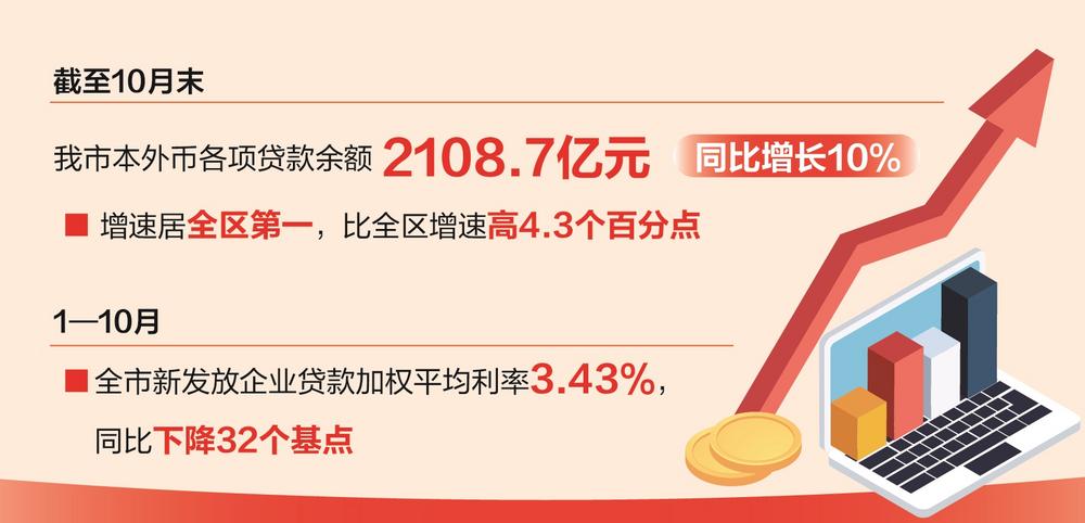 截至10月末,我市本外币各项贷款余额2108.7亿元,同比增长10%,增速居全区第一,比全区增速高4.3个百分点。“十四五”时期,全市各项贷款规模实现翻一番,交出一份金融支持实体经济高质量发展的亮眼答卷。