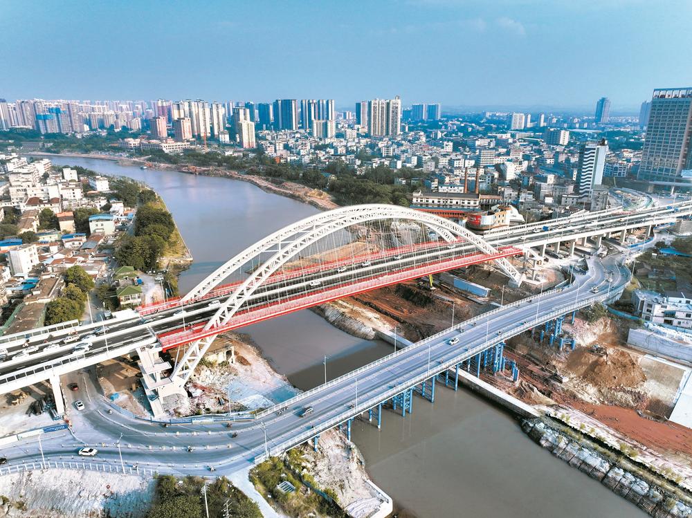 广西平陆运河建设有限公司工程管理部副部长韦宣桥介绍:“我们在施工中克服了老城区管线迁改、人流密集区保通保畅压力大、多单位多专业交叉施工协调难、闹市区施工安全管控要求高、大型钢结构运输及安装技术难度大等诸多挑战。通过‘水运运输+低位支架拼装+液压整体竖转’综合方案完成主拱安装,并采用‘拱桥桥面梁自架设安装系统’完成主梁安装,实现安全精准高效施工。”