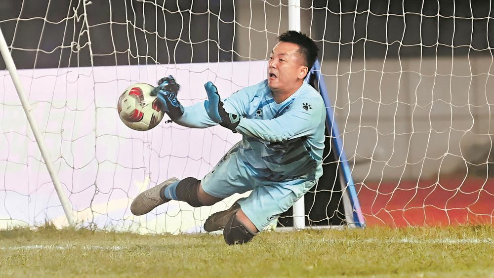 1月17日,在广西钦州市体育中心足球场,灵山队守门员赖春荣在比赛中扑出点球。 张爱林 摄