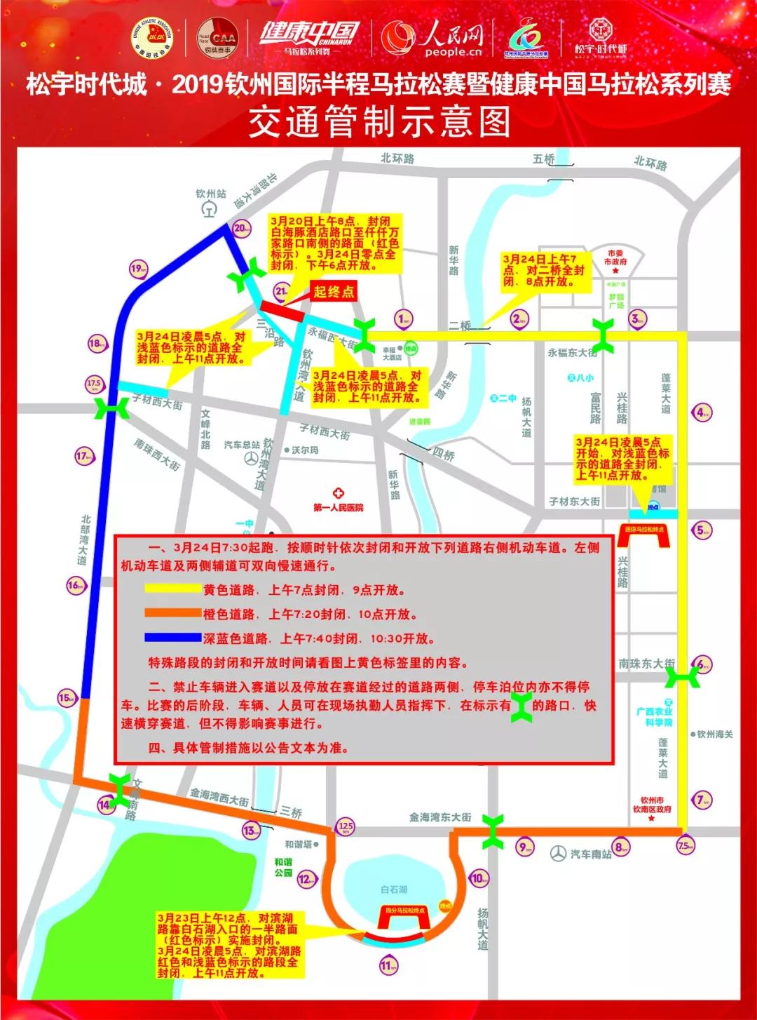 2019钦州国际半程马拉松赛暨健康中国马拉松系列赛将于2019年3月24日(星期日)早上在我市举行,7:30鸣笛起跑,至11:00赛事有关活动结束。从3月20日开始,将对有关活动场地开始布置场地。为确保活动有序、安全进行,根据《中华人民共和国道路交通安全法》的有关规定,公安机关将对活动有关道路实施临时交通管制。