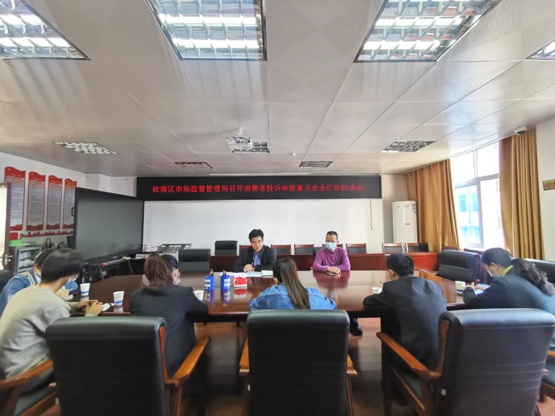 3月9日上午,钦南区市场监管局组织消费者投诉举报较集中的企业召开行政约谈会。