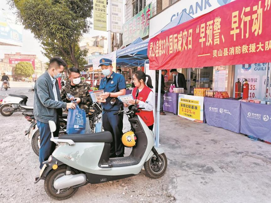 为从源头上防范化解群众身边的安全风险,筑牢防灾减灾救灾全民防线,近日,灵山县消防救援大队联合桂林银行等,积极开展第33个国际减灾日“早预警、早行动”主题诚信宣传活动。