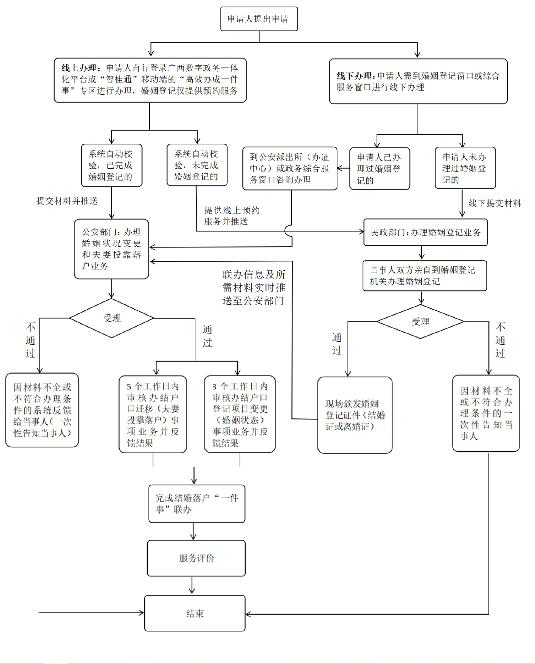 结婚落户“一件事”办结时限为5个工作日,其中: