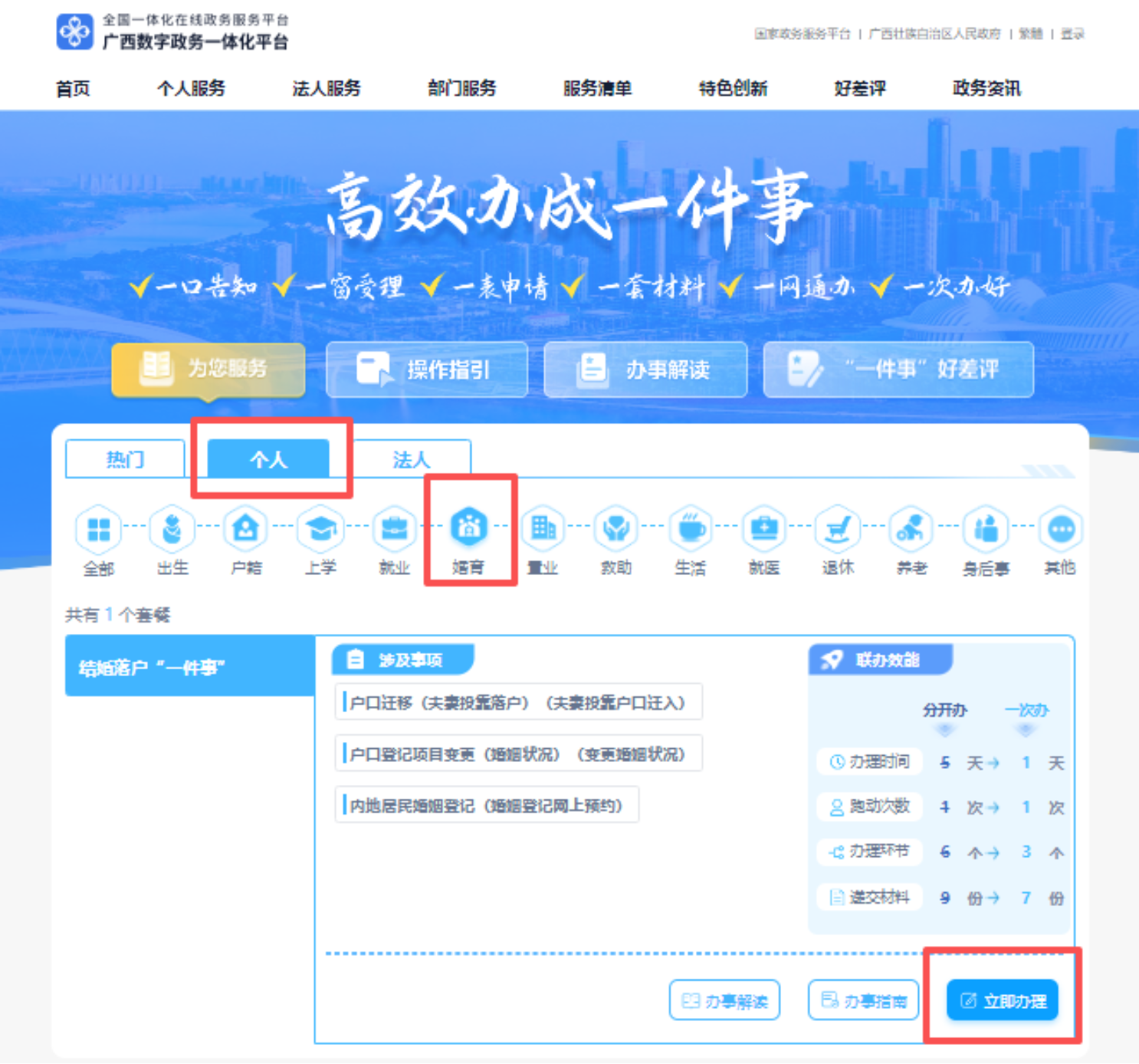 ③在“高效办成一件事”专区,选择“个人—婚育—立即办理—选择办理区域”进入结婚落户“一件事”页面。