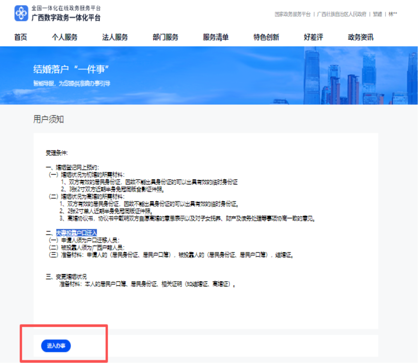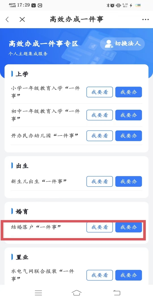 ①打开智桂通APP,点击“办成一件事”专区,找到结婚落户“一件事”事项,点击“我要办”,进入办事环节。
