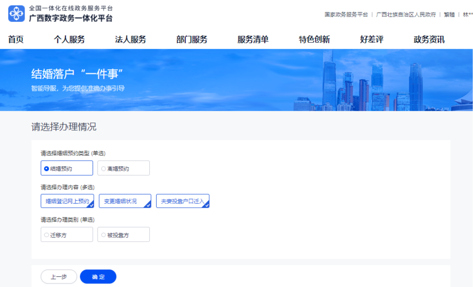 ④点击“进入办事”,根据办理需求选择“办理类型(结婚/离婚)—办理内容(婚姻登记网上预约/变更婚姻状况/夫妻投靠户口迁入)—办理类别(迁移方/被投靠方)—确定”。