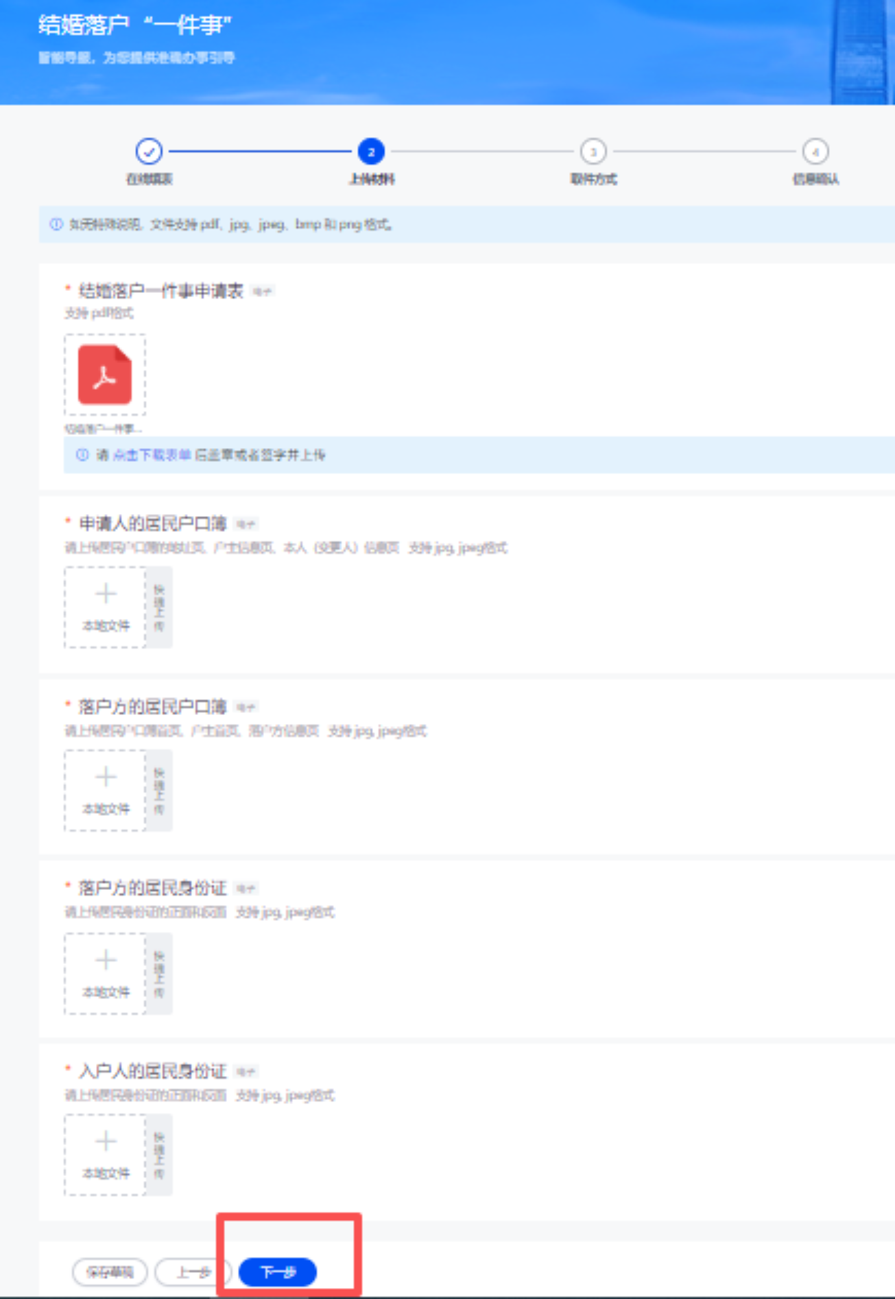 ⑥上传结婚落户一件事申请表,申请人、落户方的居民户口簿、落户方、入户人的居民身份证等材料,标星号的为必传项,点击“下一步”。