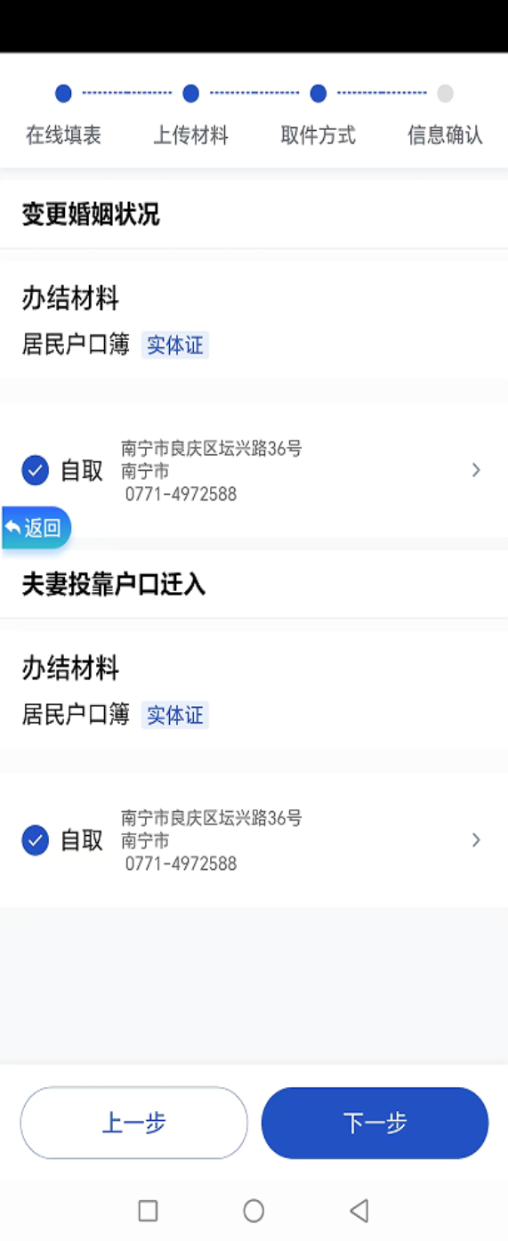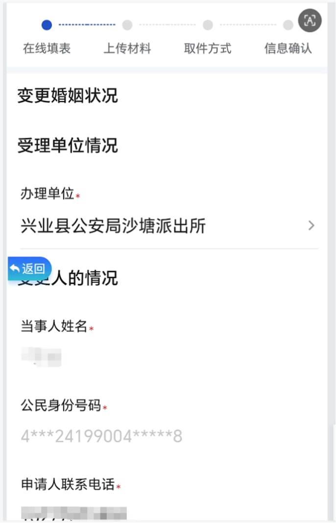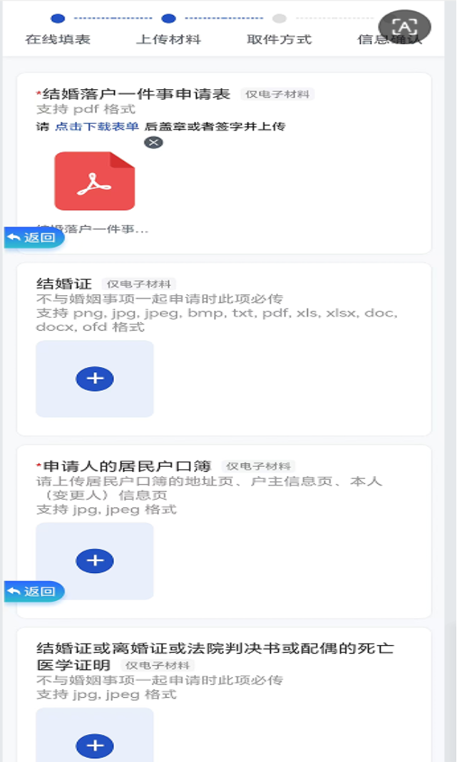 ③按操作提示填写“在线填表—上传材料—取件方式—信息确认”。