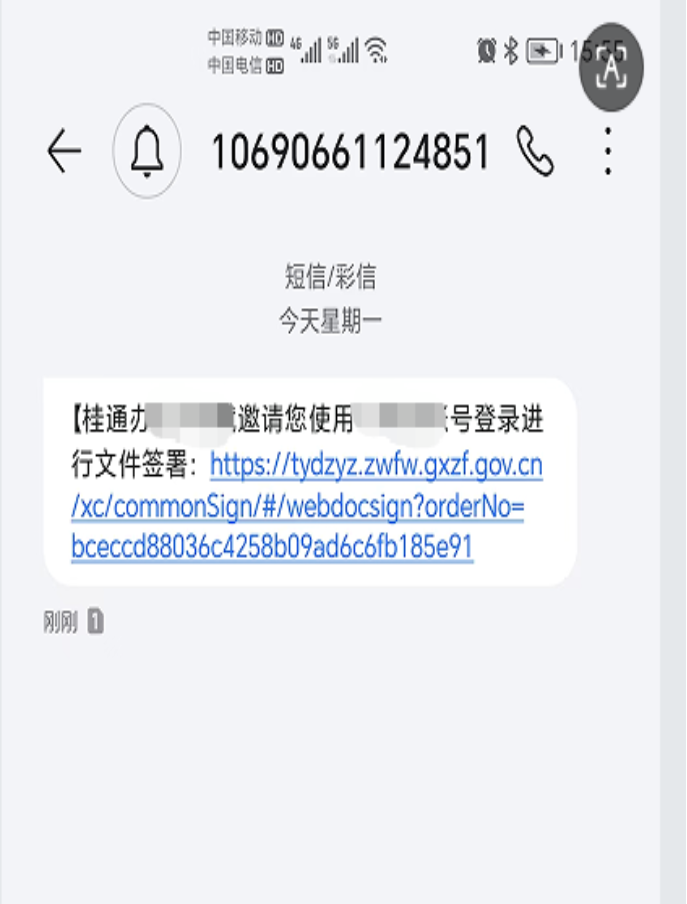 ④提交成功后,智桂通会下发手机短信,提醒签署文件。打开短信,点击文件签署的地址,根据提示在“智桂通”中打开,选择“业务文档”点击要签署的文件。