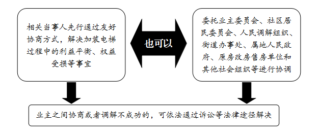 针对公示和工程建设期间相关利害关系人可能提出实名制反对意见这一情况,《通知》明确需引导相关当事人先行通过友好协商的方式,解决加装电梯过程中的利益平衡、权益受损等事宜,也可以委托业主委员会、社区居民委员会、人民调解组织、街道办事处、属地人民政府、原房改房售房单位和其他社会组织等进行协调。如自我协商不成或经业主委员会组织协商后仍未成功调解的,由属地社区居委会、街道或者人民政府通过召开协调会、听证会等方式组织调解,积极搭建沟通协商平台,鼓励引入第三方评估机构,尽可能消除意见分歧、达成共识,实现政府引导、居民自治、社会参与的良性互动,打造共建共治共享的社会治理新格局。
