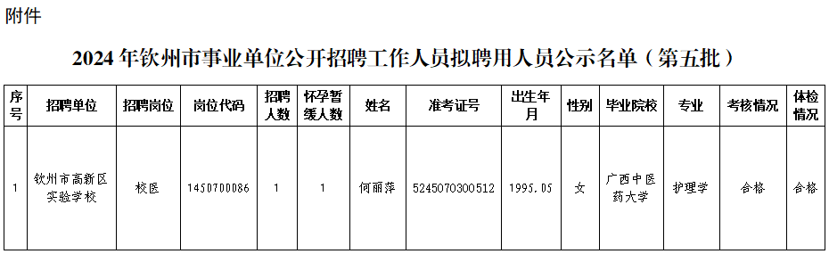 附件:2024年钦州市事业单位公开招聘工作人员拟聘用人员公示名单(第五批)