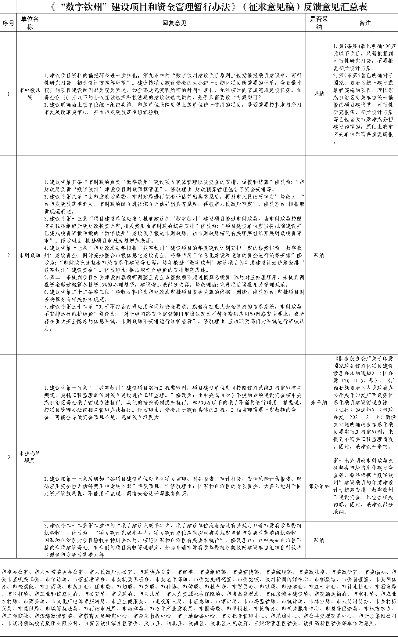 关于对《“数字钦州”建设项目和资金管理暂行办法》(征求意见稿)的采纳情况