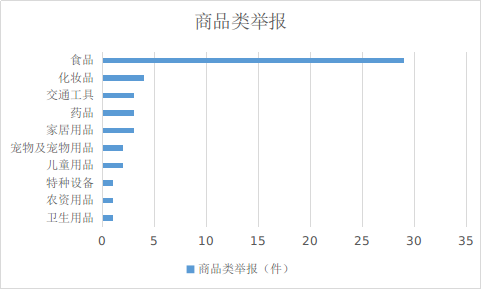 2023年8月,商品类举报排名靠前的是:食品(29件)、化妆品(4件)、交通工具(3件)、药品(3件)、家居用品(3件)。