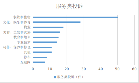 2023年9月,服务类投诉排名前十位的是:餐饮和住宿服务(50件)、文化和娱乐及体育服务(28件)、物业服务(18件)、美容和美发及洗浴服务(16件)、教育和培训服务(15件)、专业技术服务(14件)、制作和保养及修理服务(11件)、其他服务(11件)、停车服务(8件)、互联网服务(7件)。