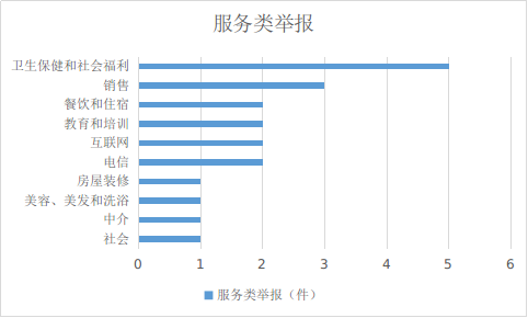 2023年9月,服务类举报排名靠前的是:卫生保健和社会福利(5件)、销售服务(3件)。