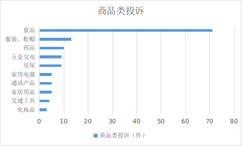 2024年1月份,商品类投诉排名前十位的是:食品(71件)、服装和鞋帽(13件)、药品(10件)、五金交电(9件)、房屋(9件)、家用电器(5件)、通讯产品(5件)、家居用品(5件)、交通工具(4件)、化妆品(3件)。