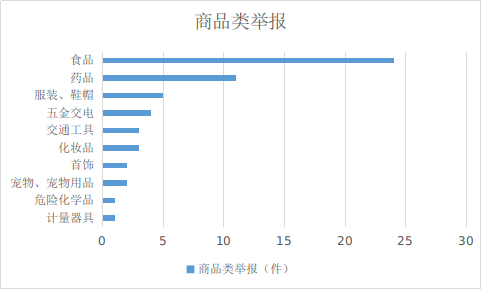 2024年1月份,商品类举报排名靠前的是:食品(24件)、药品(11件)、服装和鞋帽(5件)、五金交电(4件)、交通工具(3件)、化妆品(3件)。