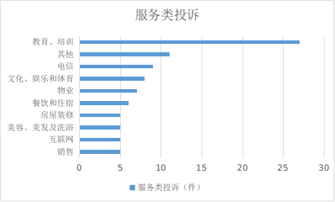 2024年1月份,服务类投诉排名前十位的是:教育和培训服务(27件)、其他服务(11件)、电信服务(9件)、文化和娱乐及体育服务(8件)、物业服务(7件)、餐饮和住宿服务(6件)、房屋装修服务(5件)、美容和美发及洗浴服务(5件)、互联网服务(5件)、销售服务(5件)。