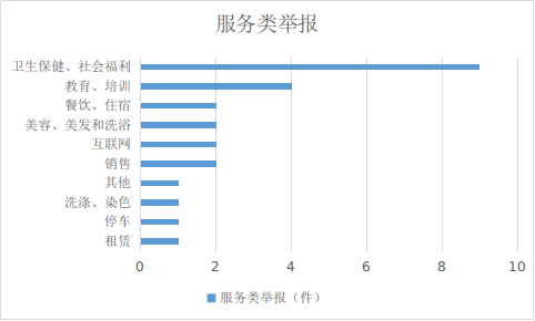 2024年1月份,服务类举报排名靠前的是:卫生保健和社会福利(9件)、教育和培训服务(4件)、餐饮和住宿服务(2件)、美容和美发及洗浴服务(2件)、互联网服务(2件)、销售服务(2件)。