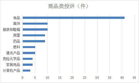 2024年2月份,商品类投诉排名前十位的是:食品(41件)、首饰(10件)、服装和鞋帽(10件)、房屋(9件)、药品(9件)、燃料(5件)、通讯产品(5件)、危险化学品(4件)、家居用品(4件)、计算机产品(3件)。