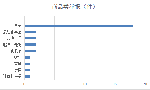 2024年2月份,商品类举报排名前十位的是:食品(18件)、危险化学品(2件)、交通工具(2件)、服装和鞋帽(2件)、化妆品(2件)。