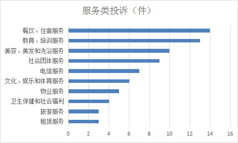 2024年2月份,服务类投诉排名前十位的是:餐饮和住宿服务(14件)、教育和培训服务(13件)、美容和美发及洗浴服务(10件)、社会团体服务(9件)、电信服务(7件)、文化和娱乐及体育服务(6件)、物业服务(5件)、卫生保健和社会福利(4件)、旅游服务(3件)、租赁服务(3件)。