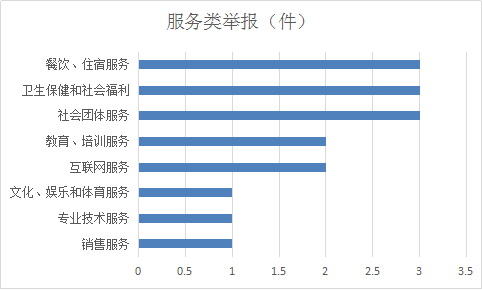 2024年2月份,服务类举报排名靠前的是:餐饮和住宿服务(3件)、卫生保健和社会福利(3件)、社会团体服务(3件)、教育和培训服务(2件)、互联网服务(2件)。