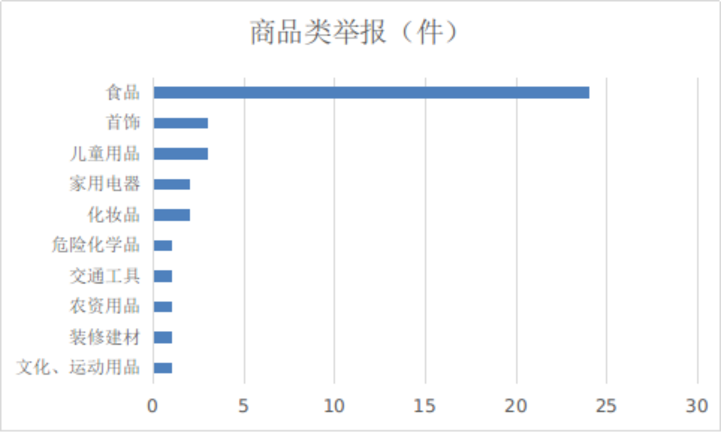 2024年4月份,商品类举报排名前十位的是:食品(24件)、首饰(3件)、儿童用品(3件)、家用电器(2件)、化妆品(2件)、危险化学品(1件)、交通工具(1件)、农资用品(1件)、装修建材(1件)、文化和运动用品(1件)。