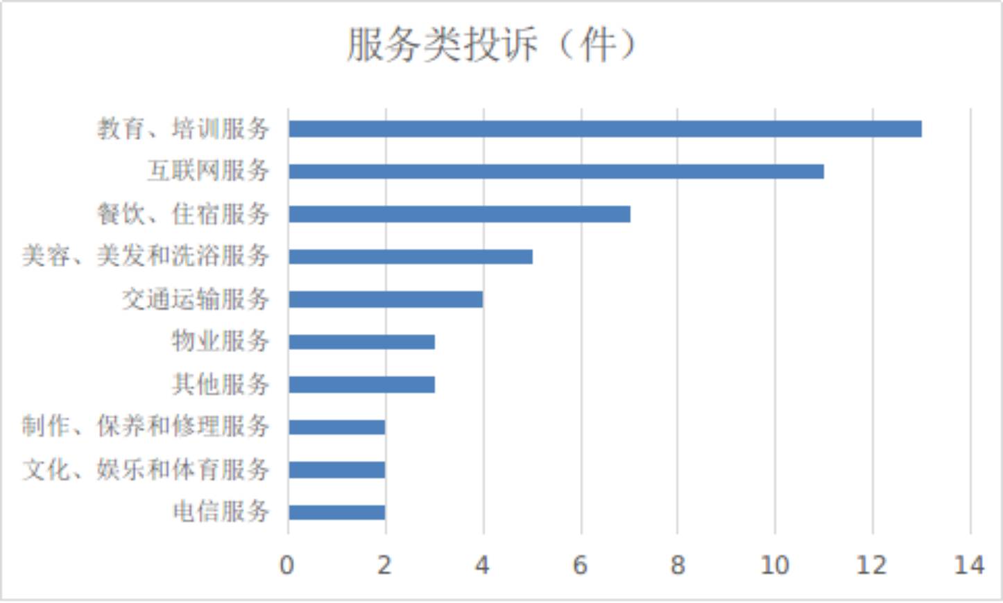 2024年4月份,服务类投诉排名前十位的是:教育和培训服务(13件)、互联网服务(11件)、餐饮和住宿服务(7件)、美容和美发及洗浴服务(5件)、交通运输服务(4件)、物业服务(3件)、其他服务(3件)、制作和保养及修理服务(2件)、文化和娱乐及体育服务(2件)、电信服务(2件)。