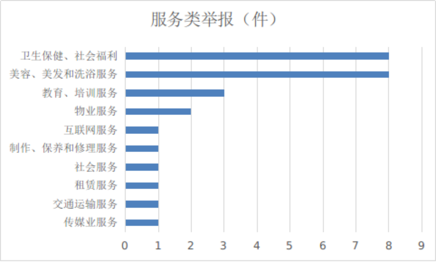 2024年4月份,服务类举报排名前十位的是:卫生保健和社会福利(8件)、美容和美发及洗浴服务(8件)、教育和培训服务(3件)、物业服务(2件)、互联网服务(1件)、制作和保养及修理服务(1件)、社会服务(1件)、租赁服务(1件)、交通运输服务(1件)、传媒业服务(1件)。